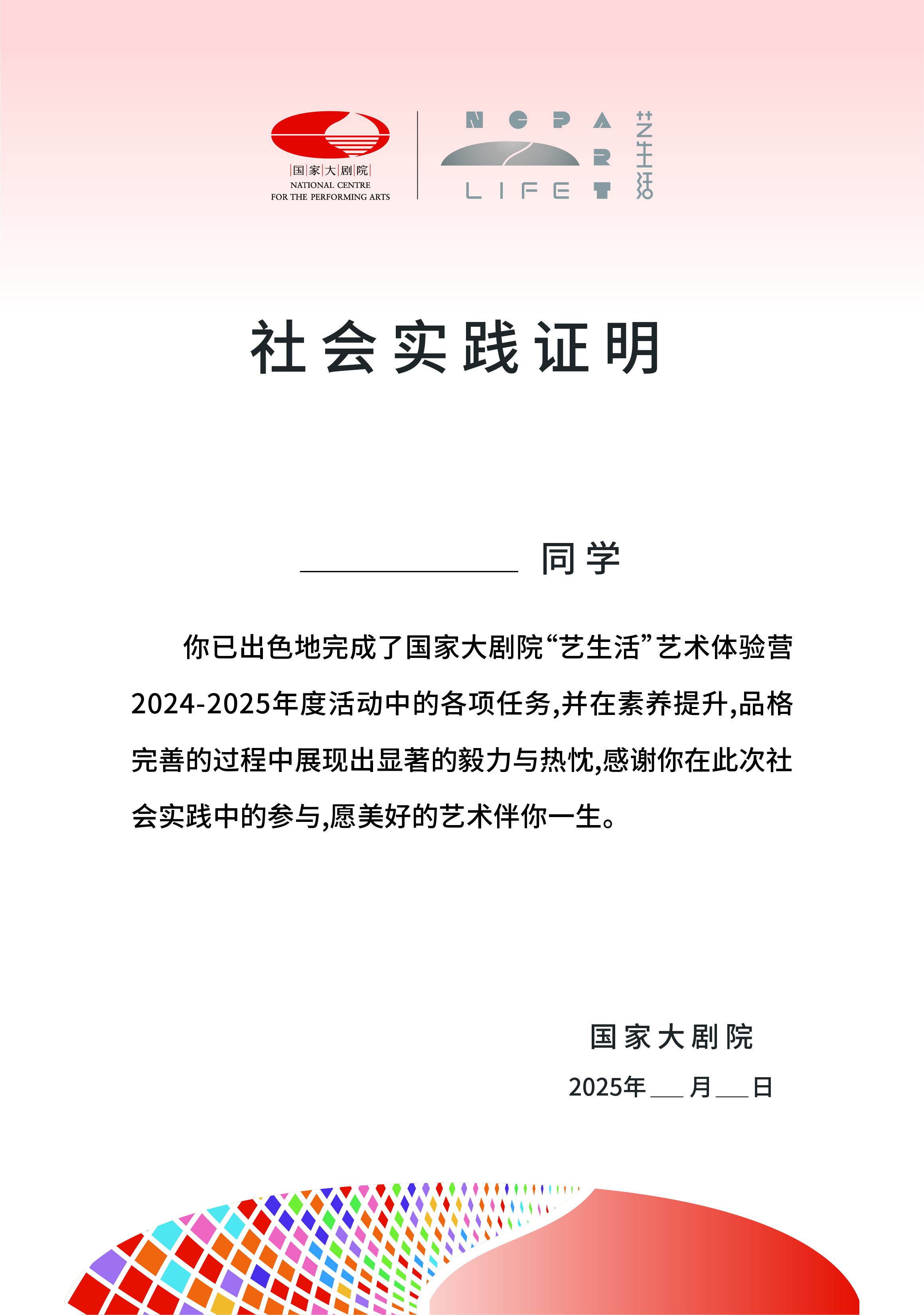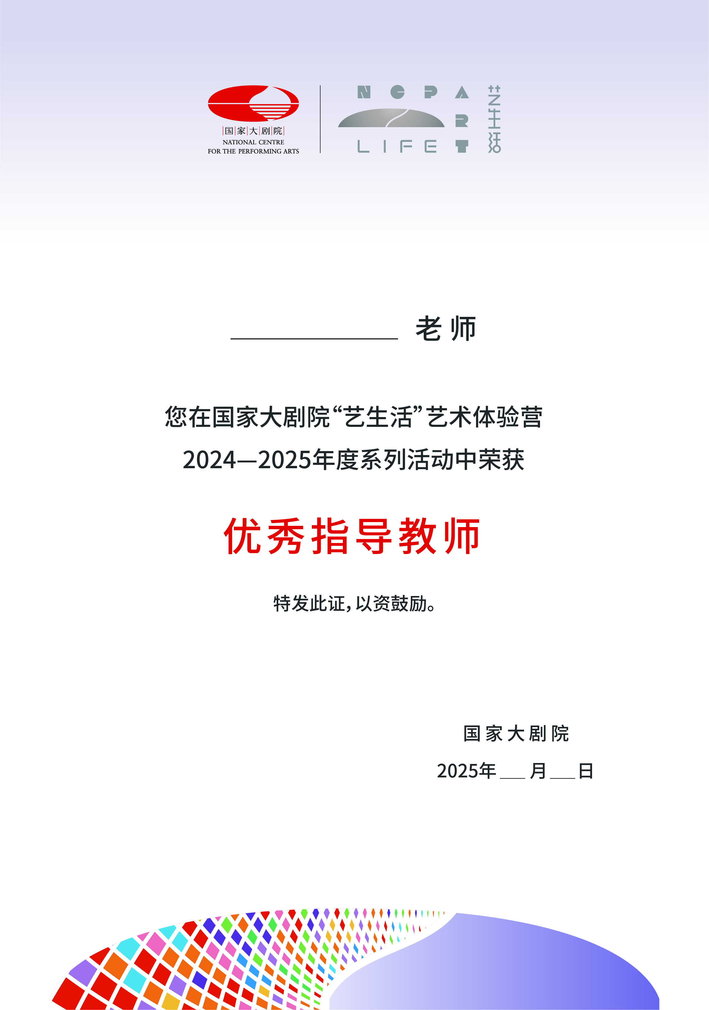1.所有参加人员由国家大剧院颁发 “优秀指导教师”证书, “最佳小演员”证书,“社会实践”证书。